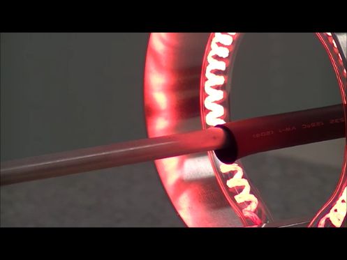 Ini adalah demonstrasi pengolahan batang tulangan menjadi tabung yang dapat menyusut dengan menggunakan pemanas cincin karbon.