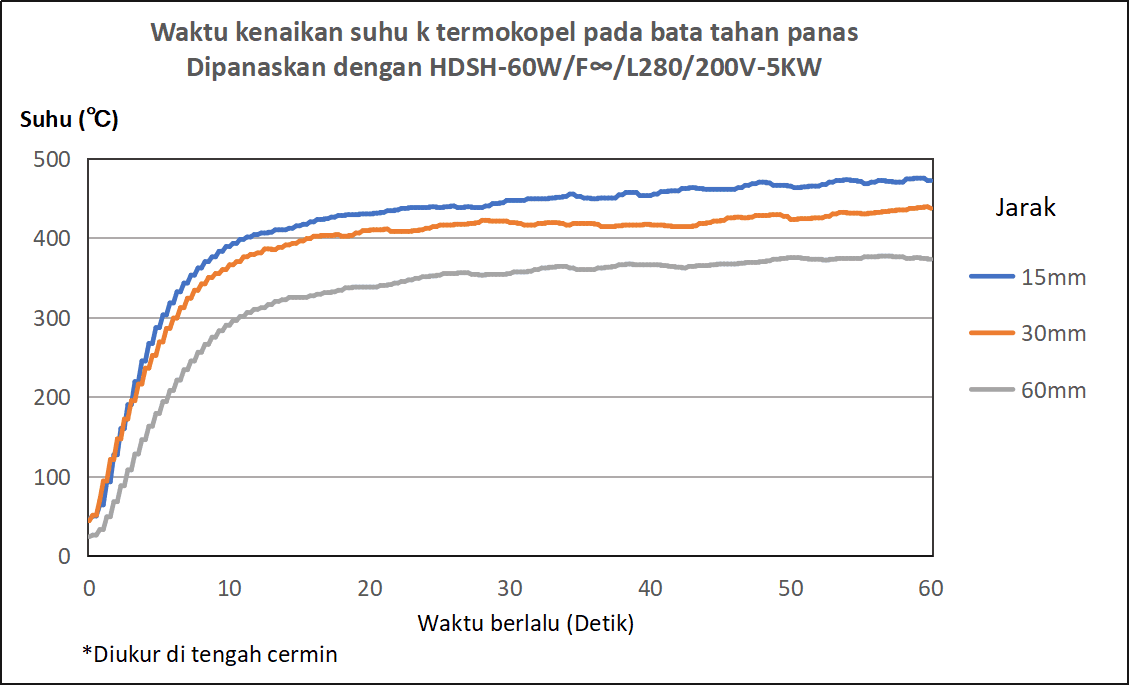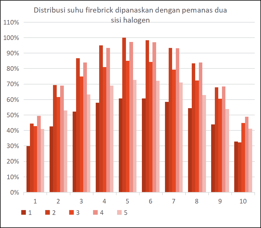 Gambar termal dibagi pada suhu maksimum suhu kisaran cermin (280mmx60mm) dari pemanas double -double halogen pada suhu maksimum, dan distribusi suhu batu bata yang resistan panas diukur.